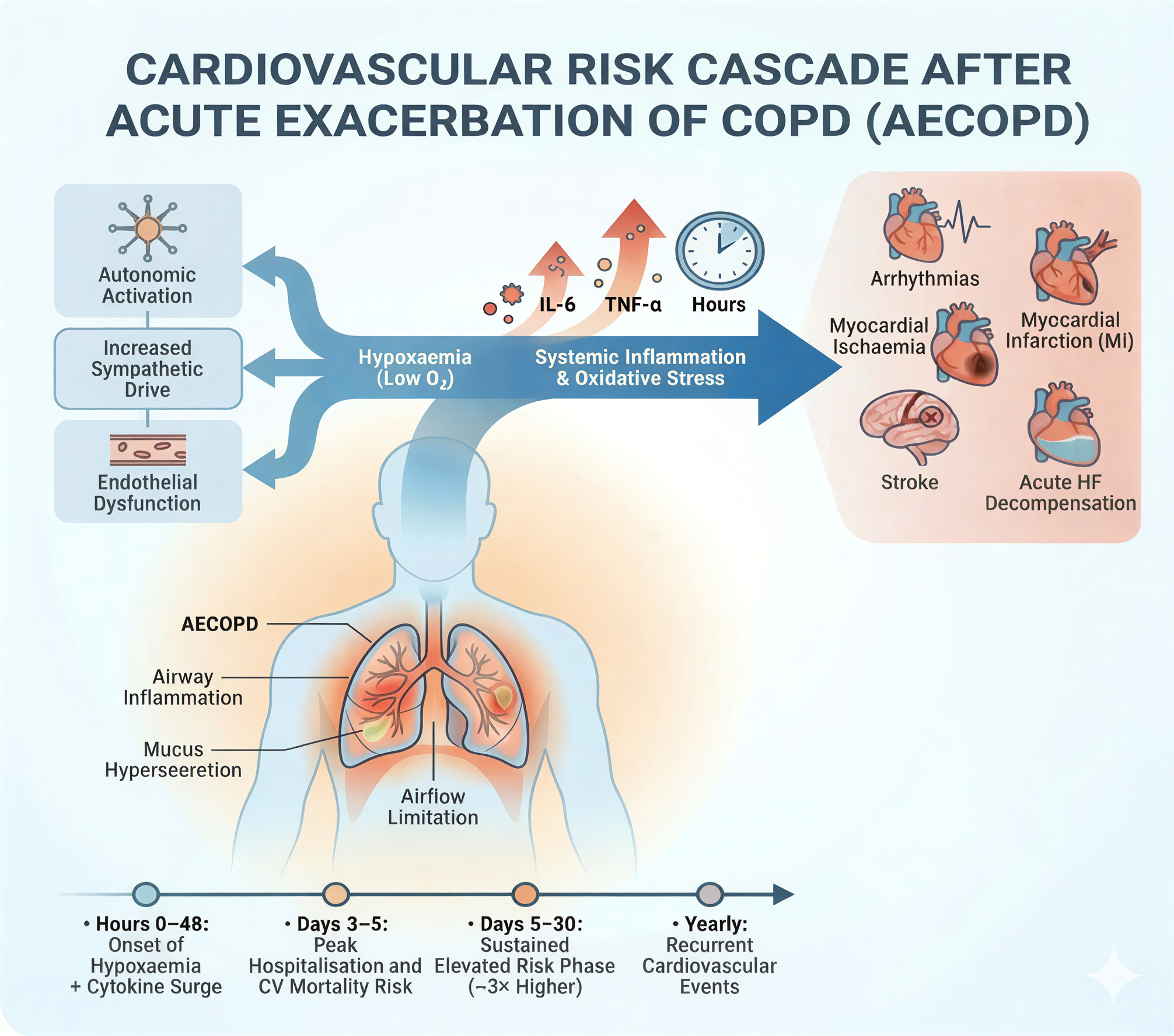 An acute exacerbation of COPD (AECOPD) is typically framed as a lung event, worsening breathlessness, cough, or sputum that prompts additional therapy. What is often under-recognised is that an exacerbation can also act as a systemic cardiovascular stressor. In the hours and days after onset, there is a short, high-risk window in which acute cardiovascular events become more likely, including myocardial infarction, arrhythmias, acute heart-failure decompensation, and stroke [1–3].