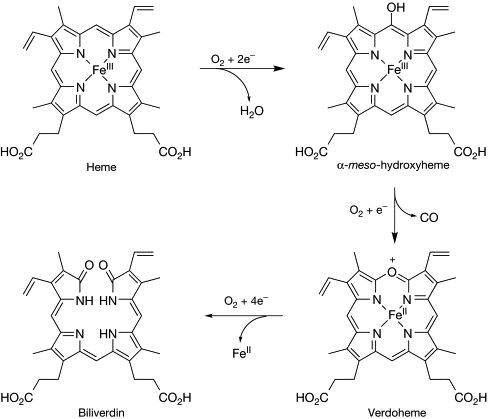 [8] The Role of Heme Oxygenase-1 in Pulmonary Disease, Laura E Fredenburgh, Mark A Perrella, S. Alex Mitsialis, Division of Pulmonary and Critical Care Medicine, Department of Medicine, Brigham and Women’s Hospital; and Division of Newborn Medicine, Children’s Hospital, Boston, Massachusetts. https://www.researchgate.net/figure/Degradation-of-heme-by-HO-1-HO-1-catalyzes-heme-degradation-to-biliverdin-IX-CO-and_fig1_6812848